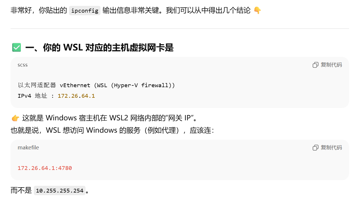 1、首先在Windows的命令行下面执行 ipconfig ,获取所有IP地址,发给gpt,他会告诉你WSL走的是哪个IP